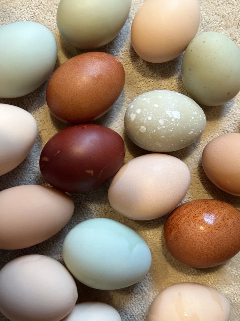 Behold a carton brimming with nature’s palette — eggs from our cherished Marans, Ameraucanas, Olive Eggers, Orpingtons, Leghorns, Legbars, and Wyandottes, each shell a delicate masterpiece painted by the hand of vibrant life. Imagine deep, lustrous chocolate browns from the Marans, deep pistachio greens from Olive Eggers, and gentle blue and lavender hues gifted by the Ameraucanas and Cream Legbars. The Orpingtons and Wyandottes lend their warm cream tones and soft speckled patterns, weaving a tapestry of color that rivals the most exquisite rainbow.