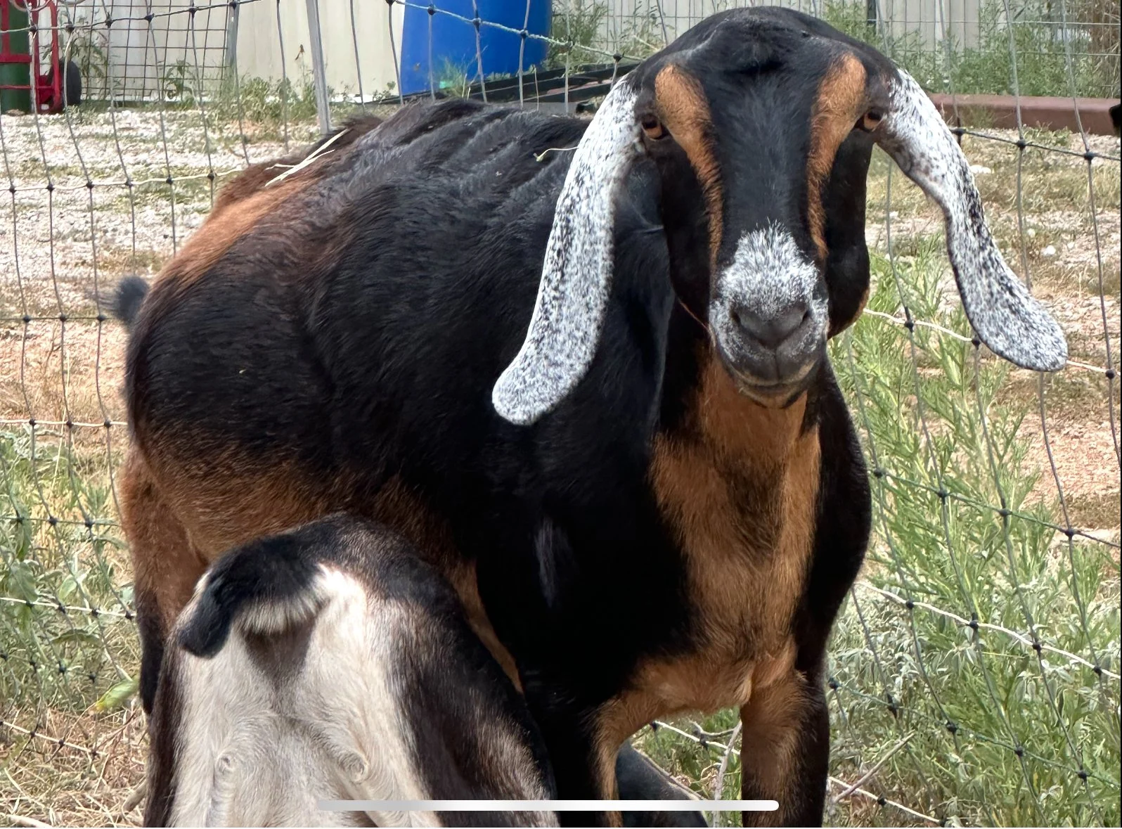 Purebred Nubian - Our first dairy goat to kid at the ranch. We purchased Annie in November of 2024 as a bred doe. She freshened for the third time and gave birth to twins on February 1st, 2025.